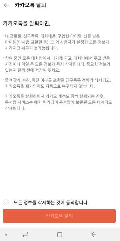 위와같이 한번더 주의사항이 있어요 여기서 내가 탈퇴를 누르면 현재 카카오톡에 저장된 모든 정보가 다 삭제가 되는것이니까 다시한번 생각해서 결정을 해주세요