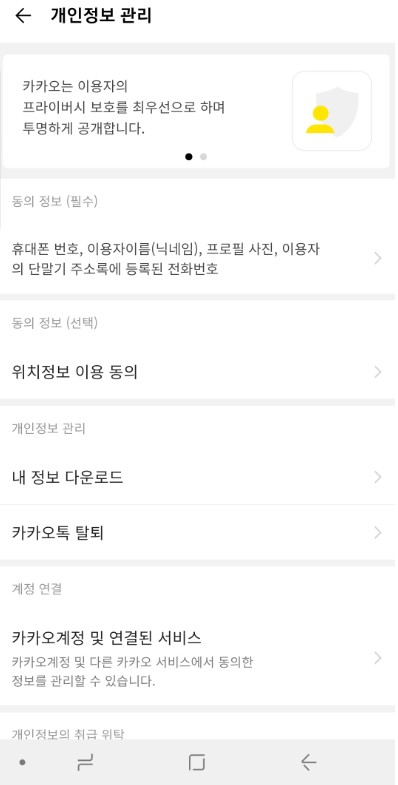 휴대폰 정보 이용자이름과 닉네임등의 변경도 가능하고요 내 정보 다운로드도 가능한데요 여기서 카카오톡 탈퇴 메뉴가 잇습니다
