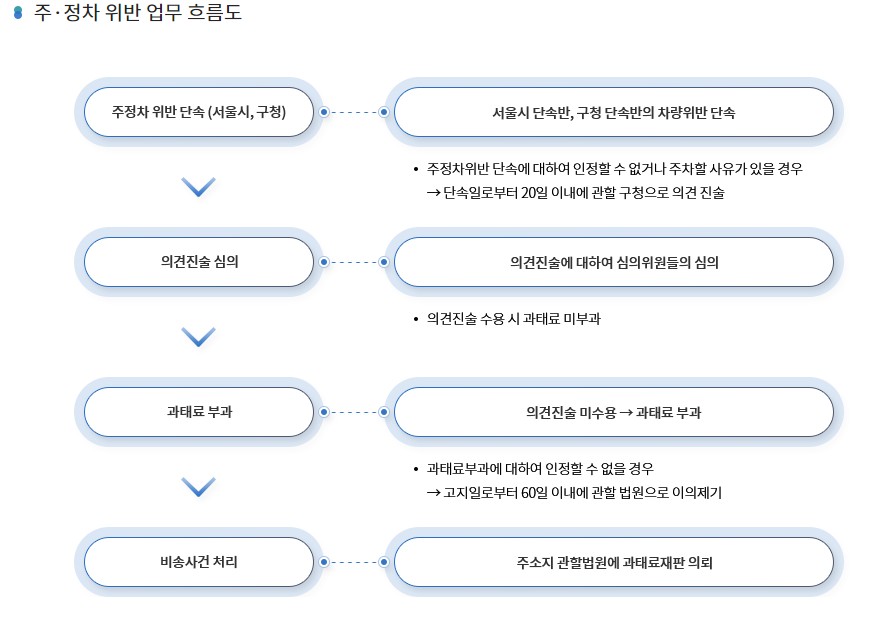 위와같이 주정차에 대한 업무 흐름도를 살펴보면 주정차 위반단속은 서울시나 구청에서 하고 있고요 그리고 과태료 부과가 되는 것을 알수 있습니다.