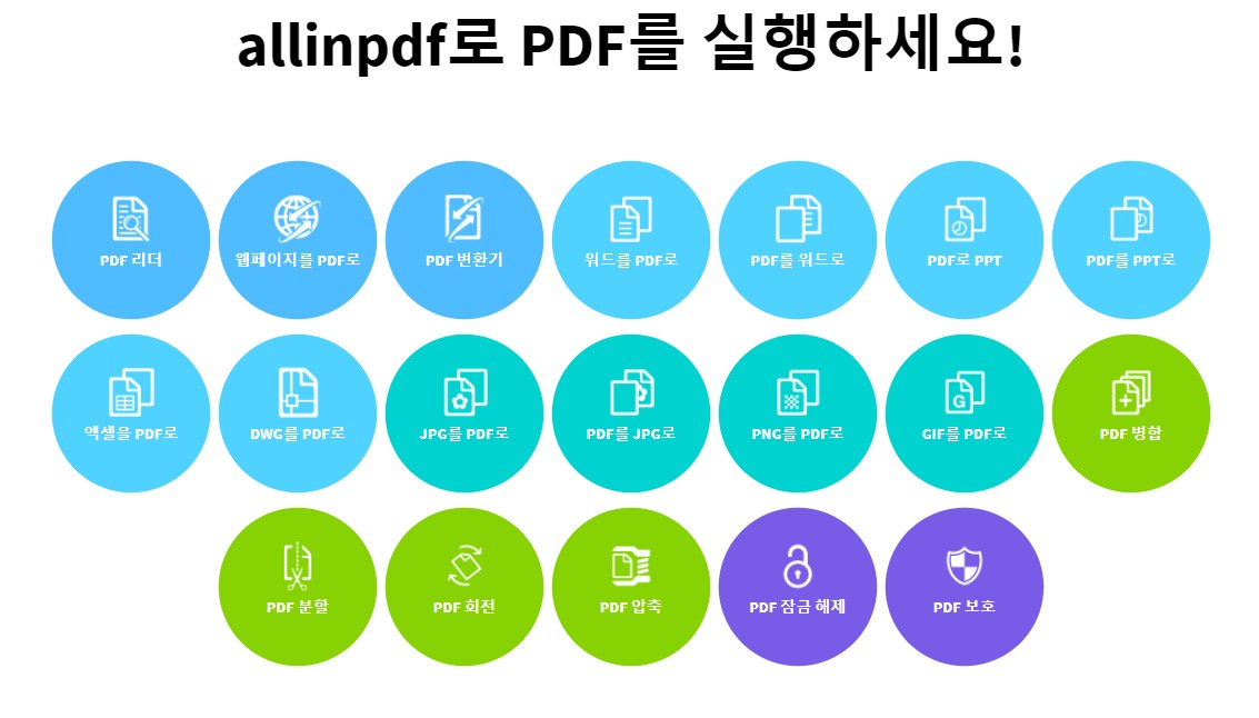 allinpdf 사이트에 방문을 하면 다양한 pdf 변환 메뉴가 나옵니다. 여기서 내가 필요한 메뉴를 선택하면 되는데요 pdf 파일 자체를 읽을수 있는 리더 기능이 있고요